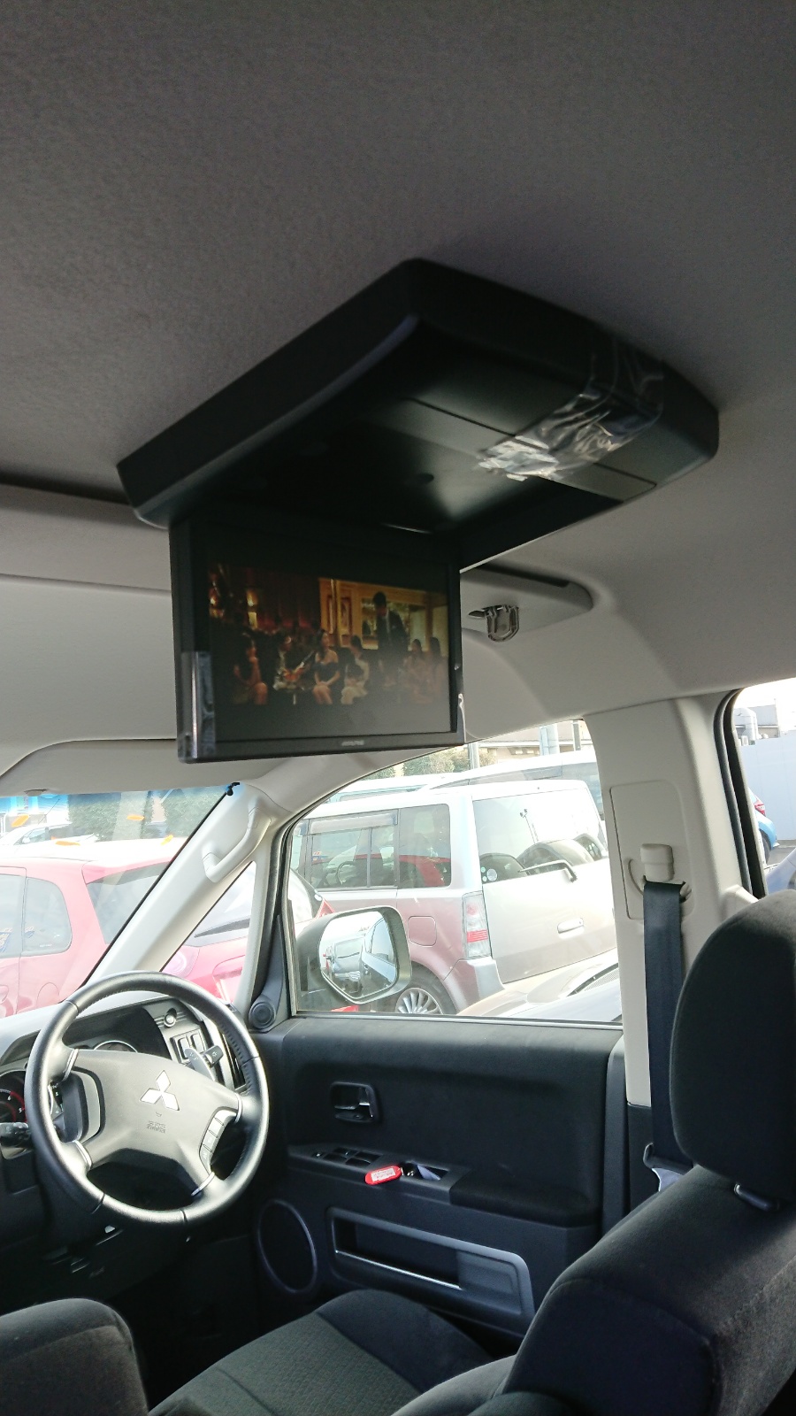 デリカD5にフリップダウンモニターの取り付けを行いました! 専用の取り付けキットを使っているので自然に収まっています。