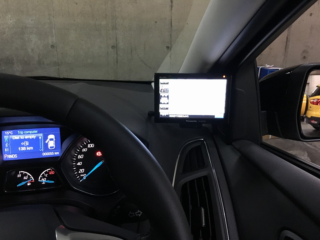 フォードのフィエスタにポータブルナビを取付しました。 専用ステーをAピラーに固定して取付です。 ベストポジションです。