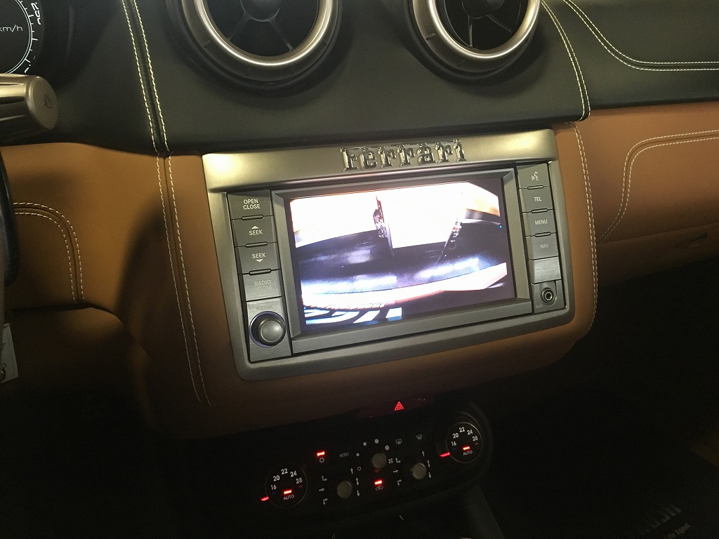 フェラーリ カルフォルニアの純正モニターにバックカメラを接続しました。 純正ナビ画面の状態で、リバースに入れると表示されます。